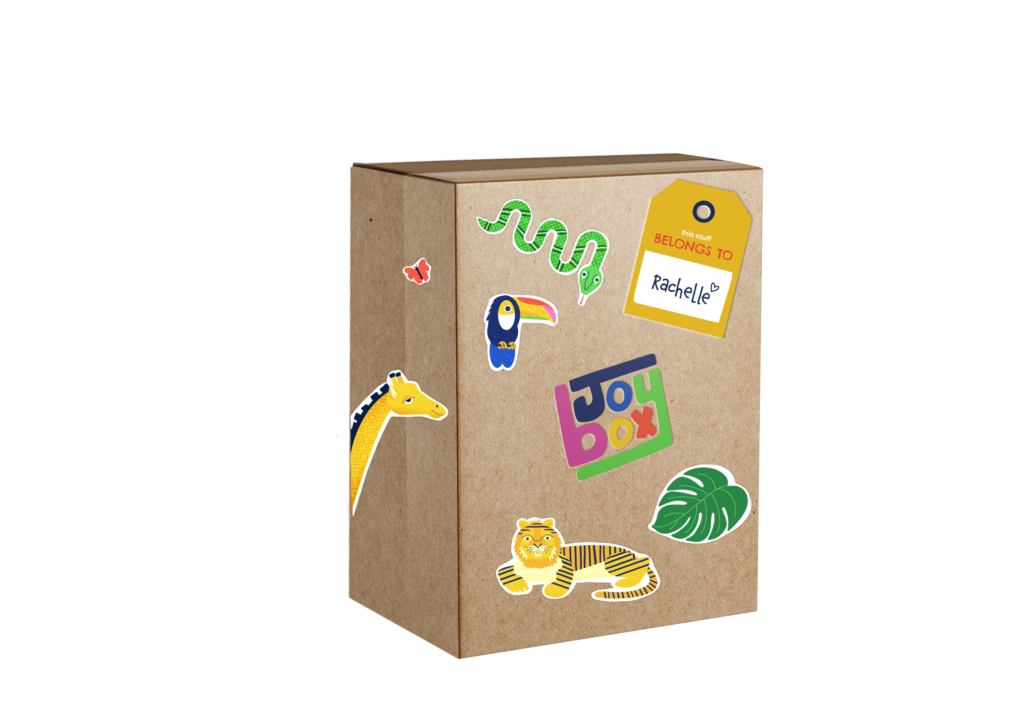 Joybox is a keepsake box filled with activities and room decorations. Choose between three colorful themes: Under the Sea, Up in Space, and In the Jungle. Customize your box with stickers.